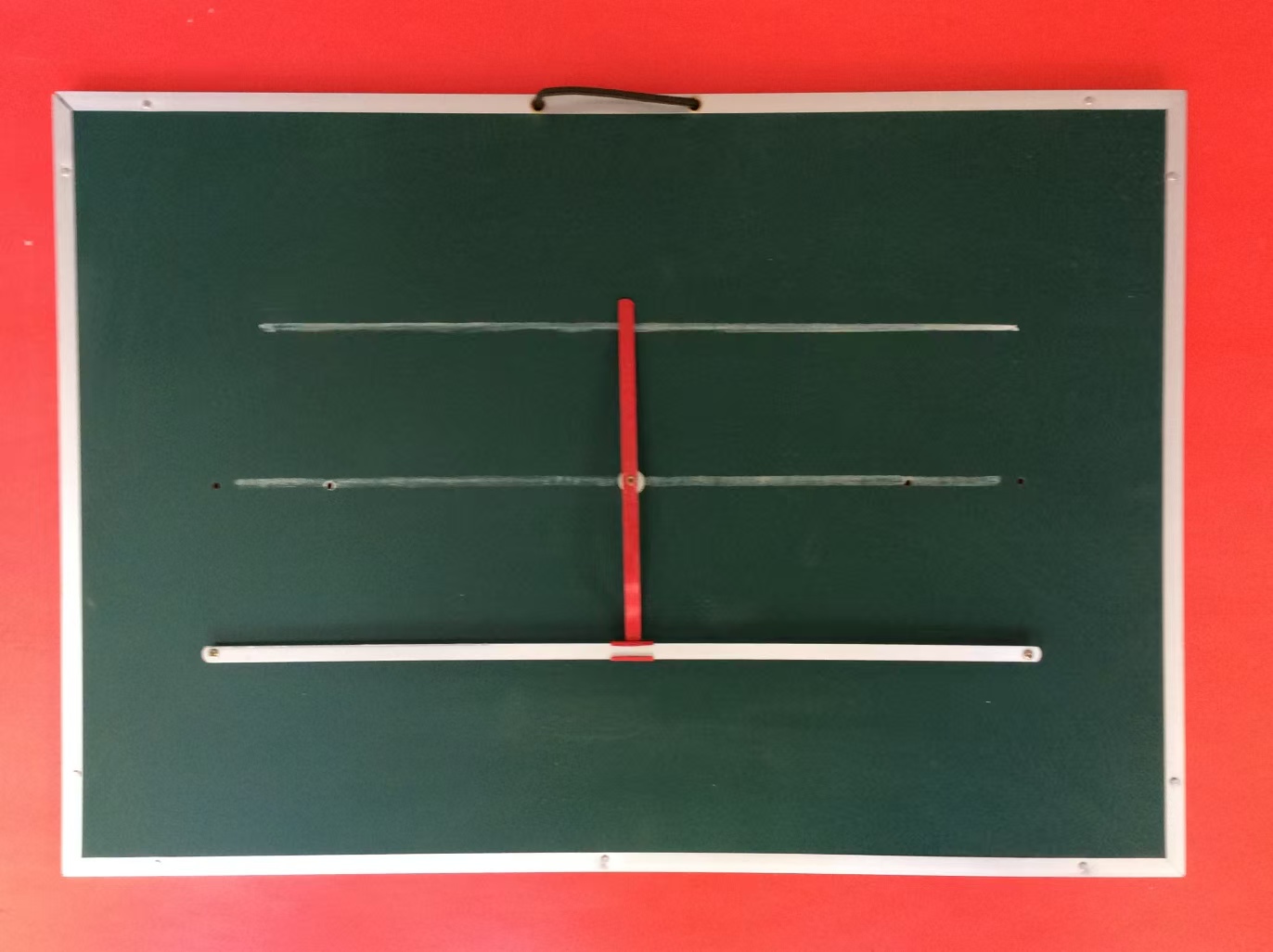 扩充型,演示用,演示黑板(500mm×350mm)板面为奥松板和墨绿色金属板粘接,边框为铝合金,组合件线条采用厚1.0mm冷轧带钢,宽度不小于8mm,经过剪切、冲压、机加工、喷漆和手工铆接而成。演示内容包含:轨迹基本型轨迹(二)和轨迹(三),增配轨迹(四)即到一条直线等距离点的轨迹;和轨迹(五)即到两条直线等距离点的轨迹。