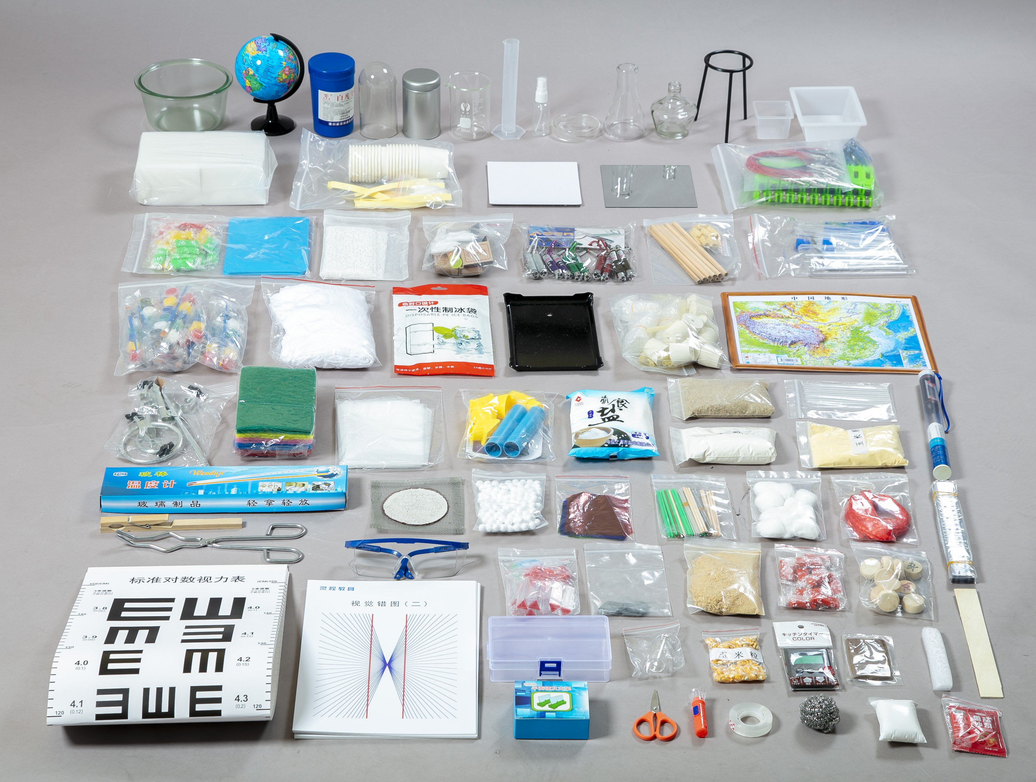苏教版五年级上册小学科学分组实验材料(十组)产品详情 本套分组实验材料依据苏教版五年级科学上册教材精心配置,旨在通过丰富多样的实验素材,引导学生探索科学知识,培养实践与观察能力。每组材料可供一个学习小组使用,助力课堂实验教学顺利开展。 教育部基础教育课程改革南师大研究中心编写设计。一、第一单元 光与色彩 “光源”实验材料- 白蜡烛:10根,作为传统的光源示例,用于观察燃烧发光现象。 - 安全火柴:10盒,用于点燃蜡烛,同时让学生了解火源使用安全。 - 5号电池:20粒,搭配电池盒为其他实验器材供电。- 5号电池盒:20个,与电池配合,为电路连接提供便利。- 带导线鳄鱼夹:20根,方便连接电路元件,构建简单电路。- 细沙:1包,100克,可用于模拟一些与光传播相关的场景,如阻挡光线等。- 细钢丝:10个,5克,可能用于搭建简易的实验结构,辅助固定或引导光线。- 塑料长方形托盘:10个,用于承载实验材料,方便操作与整理。 “光的传播”实验材料 - 小功率激光笔:10只,发出清晰的光线,直观展示光的直线传播路径。- 带盖透明长方形塑料盒:10个,可装入不同介质,观察光在其中的传播情况。- 10CM线香:1筒,点燃后产生烟雾,使光的传播路径在烟雾中更明显。 - 金属线香支架:10个,固定线香,确保实验安全。- 安全火柴:共用,用于点燃线香。- 手电筒:10个,作为常见光源,对比不同光源下光的传播效果。- 黑色硬卡纸:10张,可制作小孔、遮挡光线等,探究光的传播特点。- 单色橡皮泥:1包,用于固定卡纸、激光笔等器材,辅助实验操作。 “光的反射”实验材料 - 可调角度可直立平面镜:10套,用于探究光的反射规律,通过调整角度观察反射光线变化。 - 手电筒:共用,提供光线,观察反射现象。- 白色硬卡纸:10张,反射光线,方便观察反射角度和路径。- AN5002潜望镜套材:1套,用于组装潜望镜,理解光的反射在实际中的应用。- 标准对数视力表:10张,结合平面镜探究光的反射与视力检测原理。 “七色光”实验材料 - 较大长方形镜子:10个,与水、三棱镜等配合,分解和反射光线。- 塑料长方形水槽:10个,装水后与镜子组合,模拟彩虹形成。- 白色硬卡纸:共用,承接光线,观察光的色散现象。- 塑料小型喷雾器:10个,喷出细小水珠,模拟雨后彩虹形成条件。- 小型三棱镜:10套,分解太阳光,观察七色光。- 手电筒:共用,在室内模拟太阳光。- 红绿蓝透明玻璃纸:各10张,探究光的混合原理。- 牛顿盘:10套,快速旋转观察光的混合现象。 二、第二单元 热传递 “热传导”实验材料 - 凡士林:1筒,用于粘贴火柴等,观察热在物体上的传导。- 安全火柴:共用,蘸凡士林后粘在金属片上,观察热传导使火柴掉落顺序。- 白蜡烛:共用,加热金属片,为热传导提供热源。- 金属片:10片,作为热传导的介质,观察不同金属的热传导性能。- 铁架台:1套,固定实验器材,如金属片。- 红液温度计:20根,测量不同位置温度,探究热传导过程中的温度变化。- 250ML烧杯:10个,盛装热水,为金属片加热提供热源。- 小号玻璃水槽:1个,用于冷却或盛装其他辅助液体。 “热对流”实验材料- 7ML玻璃瓶:1个,装入带色素的水,观察热对流现象。- 红色色素:1包,添加到水中,使热对流现象更明显。- 小号玻璃水槽:共用,盛装热水,为玻璃瓶提供热环境。- 木屑:1包,悬浮在水中,直观显示热对流时水的流动方向。- 小号三脚架:1个,支撑石棉网和烧杯。- 中号石棉网:1片,使烧杯受热均匀。- 250ML烧杯:共用,加热水,产生热对流环境。- 小号酒精灯:1套,提供热源。- 安全火柴:共用,点燃酒精灯。- 10CM线香:共用,产生烟雾,辅助观察热对流在空气中的现象。- 金属线香支架:共用,固定线香。- 小号玻璃罩:1个,罩住线香,观察热对流在有限空间内的现象。- 走马灯套材(双面胶、牙签、小蜡烛、纸杯、棉线):1套,组装走马灯,探究热对流原理在实际中的应用。 “热辐射”实验材料 - 简易太阳灶套材:10套,包含制作简易太阳灶的材料,如反光板、支架等,探究热辐射原理及应用。- 小号纸板:若干,用于制作太阳灶- 锡纸:若干,增强反光效果,收集热辐射。- 15CM长、直径1.5CM玻璃管:若干,可能用于演示热辐射对物体的加热效果。“物体的传热本领”实验材料- 五种材质、长短粗细一致的小棒:10套,对比不同材质的传热性能。- 塑料珠子:10个,套在小棒上,通过珠子掉落情况判断传热快慢。- 400克凡士林:共用,粘贴珠子到小棒上。- 250ML烧杯:共用,盛装热水,为小棒加热。 三、第三单元 地球的表面和内部 “地球的表面”实验材料- 小号地形地球仪:1个,整体认识地球表面的海陆分布和地形特征。- 立体地形图:1张,直观展示地球表面地形的起伏变化- 纸质地形图卡:10张,便于学生观察和分析局部地形特征。- 中号纸板:10张,可用于制作地形模型的底盘或支撑结构。- 塑形布:10张,模拟海洋、湖泊等水体,或用于塑造地形。- 黄色海绵:10块,可切割、塑形,模拟山脉等地形。- 小盒丙烯颜料:10套,为制作的地形模型上色,区分不同地形。“火山和地震”实验材料- 小号三脚架:共用,支撑加热器材。- 小号酒精灯:共用,提供热源。- 小号石棉网:共用,使加热均匀。- 安全火柴:共用,点燃酒精灯。- 小号锥形瓶:10套,模拟火山内部结构,装入番茄酱等模拟岩浆。- 番茄酱:2包,模拟火山喷发的岩浆。- 超轻黏土:1包,用于塑造火山外部形状。- 陶泥:10块,可进一步加固和塑形火山模型。- 小段玻璃管:10根,插