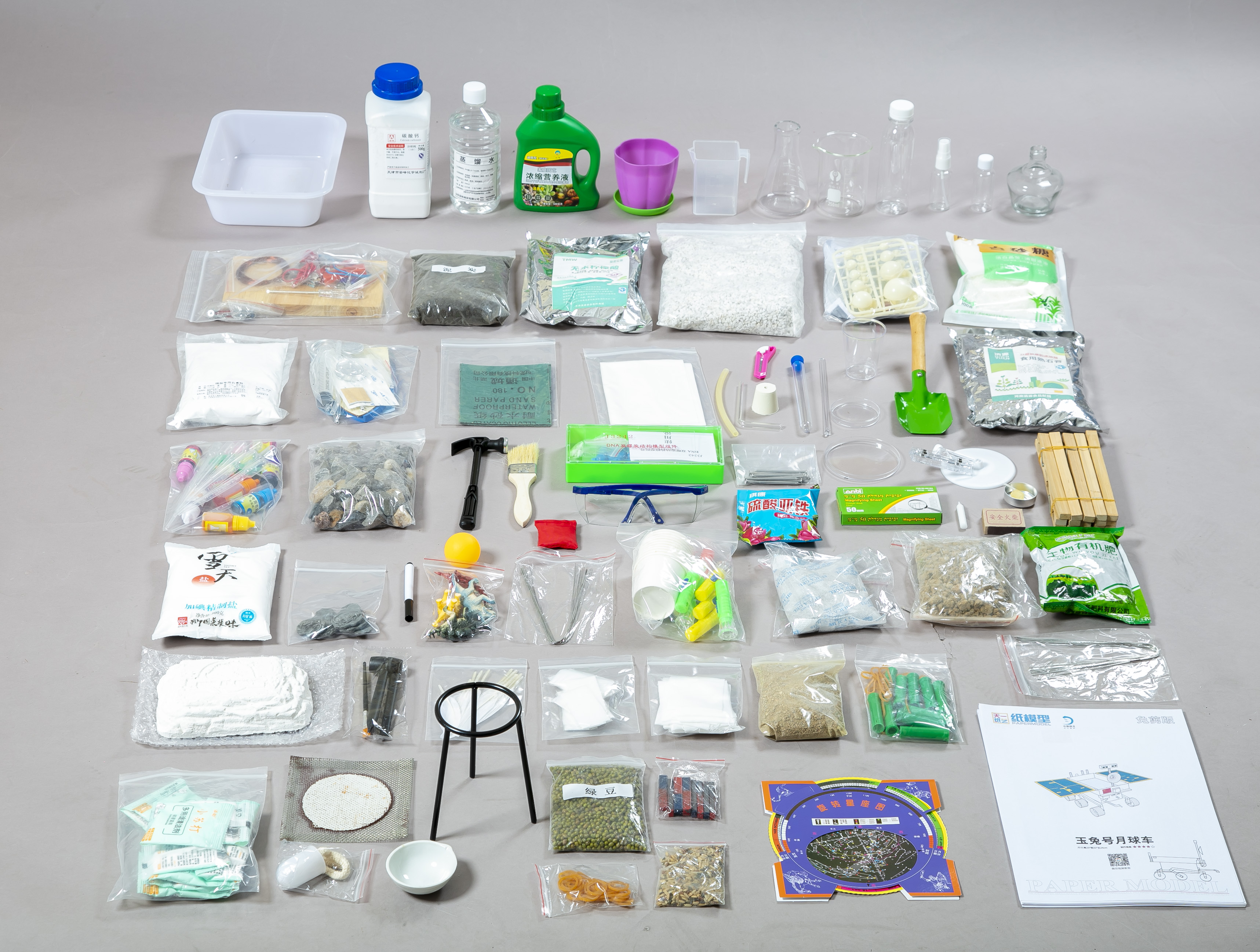 苏教版六年级上册小学科学分组实验材料(十组)产品详情本套分组材料依据苏教版六年级上册科学教材精心配备,为各单元教学提供丰富素材,助力学生开展科学探究,提升科学素养。每组材料可供一个学习小组使用,助力课堂实验教学顺利开展。 教育部基础教育课程改革南师大研究中心编写设计。(一)、第一单元 物质的变化“蜡烛的变化”材料- 白蜡烛:10根,用于观察蜡烛燃烧、熔化等物理和化学变化。- 蜡块:10块,与蜡烛对比,研究固态蜡的变化。- 棉线:10根,模拟蜡烛灯芯,探究燃烧原理。- 15cm木柄加热勺:10个,加热蜡块,观察熔化过程。- 中号铝盘:10个,承接熔化的蜡液,观察凝固现象。- 玻璃中号烧杯:1套,可用于加热水间接加热蜡块,保障安全。- 10g熟石灰:1份,检验蜡烛燃烧产物二氧化碳。- 3cm白瓷碗:10个,放在蜡烛火焰上方,收集炭黑,观察不完全燃烧现象。- 盐:1包,可尝试添加到蜡烛中,观察对燃烧的影响。- 长柄火柴:10盒,点燃蜡烛和进行加热操作。- 小刀:10个,切割蜡烛和蜡块。“铁钉生锈”材料- 小号铁钉:10根,用于研究生锈条件。- 生锈的小号铁钉:10根,对比未生锈铁钉,观察铁锈特征。- 小号铁锤:10个,敲击铁钉,观察铁锈脱落和铁钉韧性变化。- 砂纸:10张,打磨铁钉,去除铁锈,探究铁锈对铁钉性质的影响。- 塑料带盖试管:10根,分别盛装不同环境的铁钉,如干燥空气、水、食用油等,研究生锈条件。- 食用油:10瓶,用于隔绝空气,探究铁钉在油中是否生锈。- 蒸馏水:1瓶,提供纯净的水,研究铁钉在水中的生锈情况。- 干燥剂:1包,营造干燥环境,探究干燥对铁钉生锈的影响。- 小号条形磁铁:10根,检验铁锈和铁钉的磁性差异。- 小号不锈钢钉子:10根,与铁钉对比,研究不同材质的防锈性能。- 细铁丝:10根,可代替铁钉进行部分实验,观察铁丝生锈特点。“制作汽水”材料- 小苏打:10包,与白醋反应产生二氧化碳,制作汽水。- 白醋:10瓶,提供酸性物质与小苏打反应。- 食用色素:10瓶,为汽水增添颜色。- 食用柠檬酸:1包,增强汽水的酸性和口感。- 白糖:1包,增加甜味。- 小号带盖锥形集气瓶:10只,作为反应容器。 - 带胶塞软皮导管:10根,导出反应产生的二氧化碳。- 5g熟石灰:1包,检验二氧化碳。- 小号带盖塑料瓶:10瓶,用于盛装制作好的汽水。- 小号烧杯:共用,用于溶解白糖、柠檬酸等。 “化学家的研究”材料- 小号防目镜:10个,保障实验安全,防止液体飞溅- 吸水纸:1张,吸干多余液体或擦拭仪器。- 小号塑料器皿:10个,盛放实验试剂。- 带夹子塑料支架:10个,固定试管、导管等实验器材。 (二)、第二单元 遗传与变异“生物的遗传”材料 - 性状图卡:10张,展示不同生物的遗传性状。- 性状图:10张,学生可在上面记录和分析遗传性状。- 可擦拭细白板笔:10支,用于在性状图上书写和标注。“生物的变异”材料:不同品种的米10包,对比不同品种米的形态、颜色等差异,探究生物变异现象。“寻找遗传与变异的秘密”材料- 塑料DNA双螺旋结构模型:2套,直观展示DNA结构,理解遗传信息传递。- 纸质豌豆的遗传图:10张,学习孟德尔豌豆遗传实验,分析遗传规律。 三、第三单元 化石的奥秘“消失的恐龙”材料 - 多种恐龙模型:1包,了解恐龙形态和种类- 多种化石模型:1套,认识恐龙化石的形态特征。“化石告诉我们什么”材料- 天然化石:10块,观察真实化石,研究古生物特征。- 塑料放大镜:10个,辅助观察化石细节。“用化石做证据”材料:纸质生命演化史图卡10张,结合化石知识,了解生物进化历程。四、第四单元 探索宇宙“太阳系大家庭”材料 - 纸质八大行星示意图:10张,了解八大行星的位置和基本特征。- 塑料八大行星天体模型:10套,直观展示行星相对大小和轨道位置。- 不同颜色彩色卡纸:10张,可制作行星模型或标注行星信息。“观察星空”材料- 简易手电筒:10个,在夜晚观察星空时提供辅助照明。- 纸杯:10个,可制作简易星图观察器。 - 铁钉:10个,用于在纸杯上打孔制作星图观察器。- 纸质星空分区图:10张,帮助学生识别不同星座和星空区域。 “冲出地球”材料 - 小球:10个,模拟卫星等物体,研究物体脱离地球引力的现象。- 天然羽毛:10根,与小球对比,研究空气阻力对物体运动的影响。- 小号沙包:10个,用于抛投实验,感受重力作用。- 塑料纸火箭:10个,模拟火箭发射,探究火箭升空原理。- 不同粗细橡皮筋:10根,为纸火箭提供动力,研究动力与飞行距离的关系。“探索宇宙”材料:嫦娥探月器模型10套,了解我国探月工程,激发学生对宇宙探索的兴趣。 五、第五单元 科技改变生活 “人造肥料与现代农业”材料- 200g绿豆种子:1包,用于种植实验。- 玻璃中号培养皿:20套,培育绿豆种子,观察发芽过程。- 纱布:20只,覆盖在培养皿上,保持湿度。- 200g水培营养素:1瓶,用于水培绿豆,研究营养对植物生长的影响。- 带刻度透明塑料杯:10个,用于水培实验,观察水位和植物生长情况。- 泥炭:1包,作为土壤改良剂,用于种植实验。- 珍珠岩:1包,增加土壤透气性,用于种植实验。- 中号带底花盆:10套,用于土培绿豆。- 小铲子:10把,用于装土、移栽等操作。- 化肥:1包,与有机肥对比,研究不同肥料对植物生长的影响。- 塑料棒:10根,搅拌肥料溶液或支撑植物。- 田园土:1包,用于土培实验。- 碳酸钙:1瓶,调节土壤酸碱度。- 硫酸亚铁:1包,为植物补充铁元素。“钢筋混凝土与现代建筑业”材料 - 石膏粉:1包,制作简易混凝土模型。- 沙:1