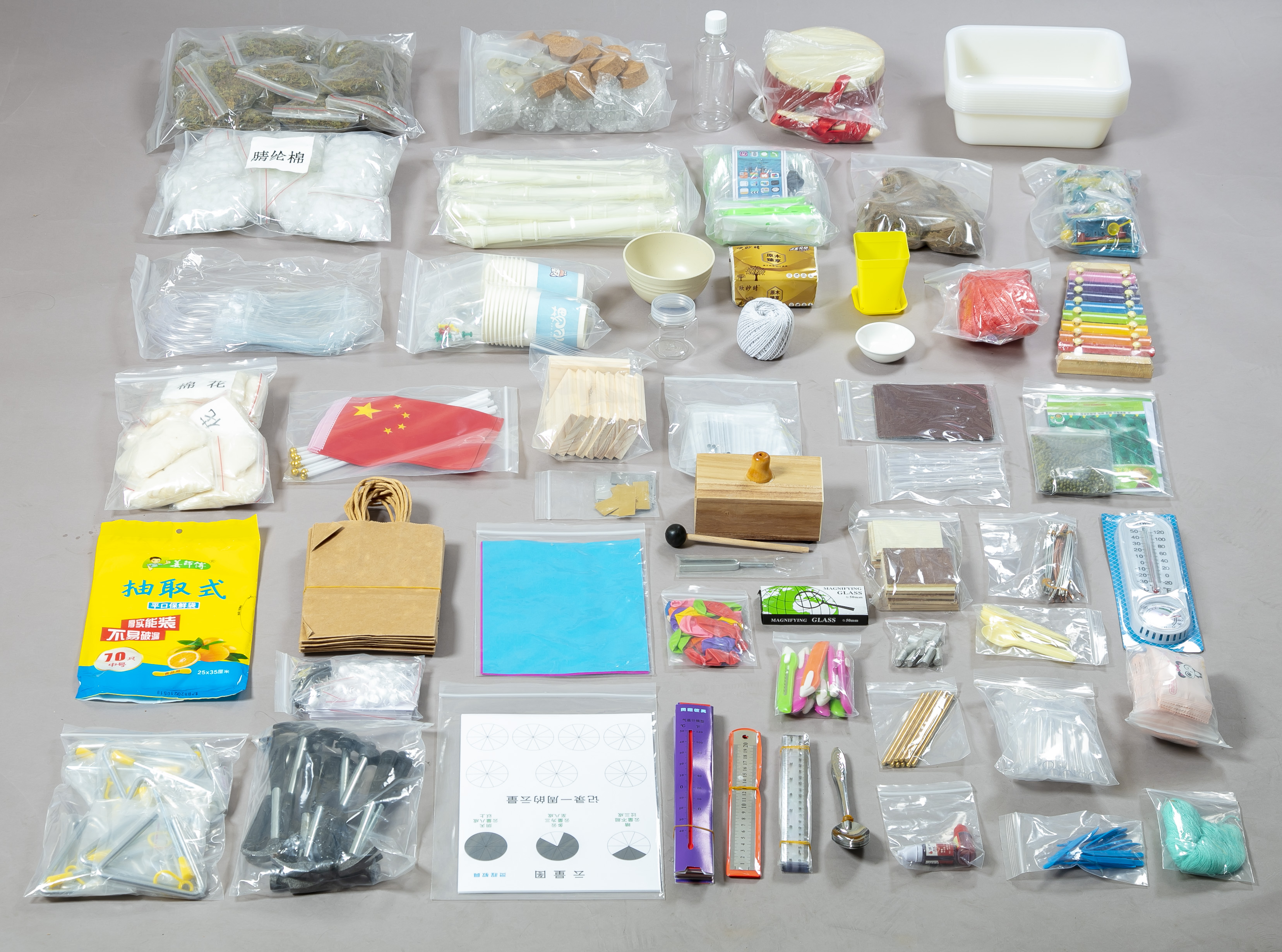 苏教版《科学》三年级下册分组实验操作材料(十组)产品详情 本套分组实验材料依据苏教版三年级科学下册教材精心配置,旨在通过丰富多样的实验素材,引导学生探索科学知识,培养实践与观察能力。每组材料可供一个学习小组使用,助力课堂实验教学顺利开展。 教育部基础教育课程改革南师大研究中心编写设计。第一单元 植物的一生种子发芽了 - 实验材料:约3克装的番茄种子、黄瓜种子各10包,约10克装的绿豆10包,塑料花盆10个,扁形带盖(广口瓶样式)的发芽实验盒40个,抽取式纸巾1盒,彩色塑料勺10包。- 实验目的:学生亲手播种,观察不同种子在花盆和实验盒不同环境下的发芽过程,了解种子萌发所需条件,培养观察与记录能力。幼苗长大了 - 实验材料:塑柄钢质小刀10把,5克装红色色素2瓶。- 实验目的:借助小刀对幼苗简单处理,利用红色色素探究植物运输系统,观察幼苗生长变化,激发对植物生理结构的好奇。 植物开花了 - 实验材料:纸质花的图卡、花的解剖图卡各10套,塑料镊子10把。- 实验目的:通过图卡了解花朵形态与内部结构,用镊子解剖花朵,探究植物繁殖过程,认识花朵授粉、结果的原理。 植物结果了 - 实验材料:纸质果实图卡、我们吃的是什么图卡各10套。- 实验目的:借助图卡认识不同果实,了解日常食用部分来自植物的哪个部位,加深对植物生命周期的理解。 第二单元 植物与环境 不同环境里的植物 - 实验材料:包含八种植物与环境的纸质图卡10份,沙漠植物图卡10套,单片装湿纸巾30包,16K蜡纸1包,直径5cm放大镜10个,不锈钢勺子10个。- 实验目的:通过图卡了解不同环境植物形态,利用湿纸巾、蜡纸、放大镜、勺子模拟和观察植物生长环境,探究植物与环境的相互关系。 沙漠中的植物 - 实验材料:同“不同环境里的植物”中的沙漠植物图卡、湿纸巾、蜡纸、放大镜、不锈钢勺子,另加塑料水槽10只,莲子种子10包。- 实验目的:以沙漠植物和水生植物莲子为对象,借助工具探究沙漠和水生环境中植物的生存策略与适应方式。 水里的植物 - 实验材料:纸质水生植物图卡10套,塑料水槽10只,莲子种子10包。- 实验目的:利用图卡和水槽,观察莲子生长,了解水生植物的生长特性与环境适应性。 石头上的植物 - 实验材料:青苔标本、卷柏标本各10包。- 实验目的:观察青苔和卷柏标本,了解生长在石头上的植物适应特殊环境的独特方式。 第三单元 声音的奥秘 声音的产生 - 实验材料:中号保鲜袋1包,20cm钢尺10把,10寸气球10只,棉纱线1卷,三种不同规格塑料试管30支,金属音叉10套。- 实验目的:通过操作这些材料制造声音,观察物体发声时的振动,理解声音由物体振动产生的原理。 声音的传播 - 实验材料:真空电铃实验电子套件1套,透明防水袋1只,电子发声器1个,AN3101声音屏10个,小号泡沫球10包,小号小鼓10个,土电话材料套材10套。- 实验目的:借助各材料演示声音在不同介质中的传播,理解声音传播需要介质及传播特性。 不同的声音 - 实验材料:金属三角铁10套,八音铝片琴10个,五种风铃管10套,八孔竖笛10支。- 实验目的:通过演奏这些乐器,感受不同声音的音高、音色等特点,体会声音的多样性。 第四单元 身边的材料 天然材料与人造材料 - 实验材料:10克装晴纶棉、棉花各10包,106cm木板10块,106cm复合板10个。- 实验目的:对比观察,了解天然材料与人造材料的区别、特性及用途。 纸 - 实验材料:A4复印纸、16K蜡光纸、A4牛皮纸、条形皱纺纸各1包,2mL塑料滴管10支。- 实验目的:通过滴水、折叠、撕扯等实验,探究不同纸张的吸水性、柔韧性、强度等特性。 金属 - 实验材料:Ф0.513cm的铜棒、铝棒、铁棒各10根,2020cm砂纸10张,13cm的铜丝、铁丝、铝丝各10根,小号锤子10把,51cm的铜片、铁片、铝片各10片,Ф12cm的铜柱体、铝柱体、铁柱体各10个。 - 实验目的:通过打磨、敲击、导电测试等实验,了解金属的光泽、延展性、导电性等物理和化学性质。 塑料 - 实验材料:手提式塑料袋、手提式纸袋各10个,小号瓷碗、小号塑料碗各10个,20厘米塑料尺10把,25克羊毛线1卷,塑料绳1卷。- 实验目的:对比观察,了解塑料与其他材料在外观、质地、重量等方面的差异及特性。 第五单元 观测天气 测量气温 - 实验材料:A001气温计、抽拉式气温计模型各10支。- 实验目的:学会使用气温计测量气温,通过模型理解气温概念和测量方法。 云量和雨 - 实验材料:纸质云量图10张,带刻度瓶子的雨量器材料10套。- 实验目的:对照云量图判断云量,制作雨量器测量降雨量,了解相关概念和对生活的影响。 风向和风力 - 实验材料:塑料风向风力计模型10套,小号小旗10面。- 实验目的:利用工具判断风向和风力,观察不同天气下的变化。 天气和气候 - 实验材料:纸质四季图卡10张。- 实验目的:结合生活经验,通过图卡理解天气和气候的概念及差异。