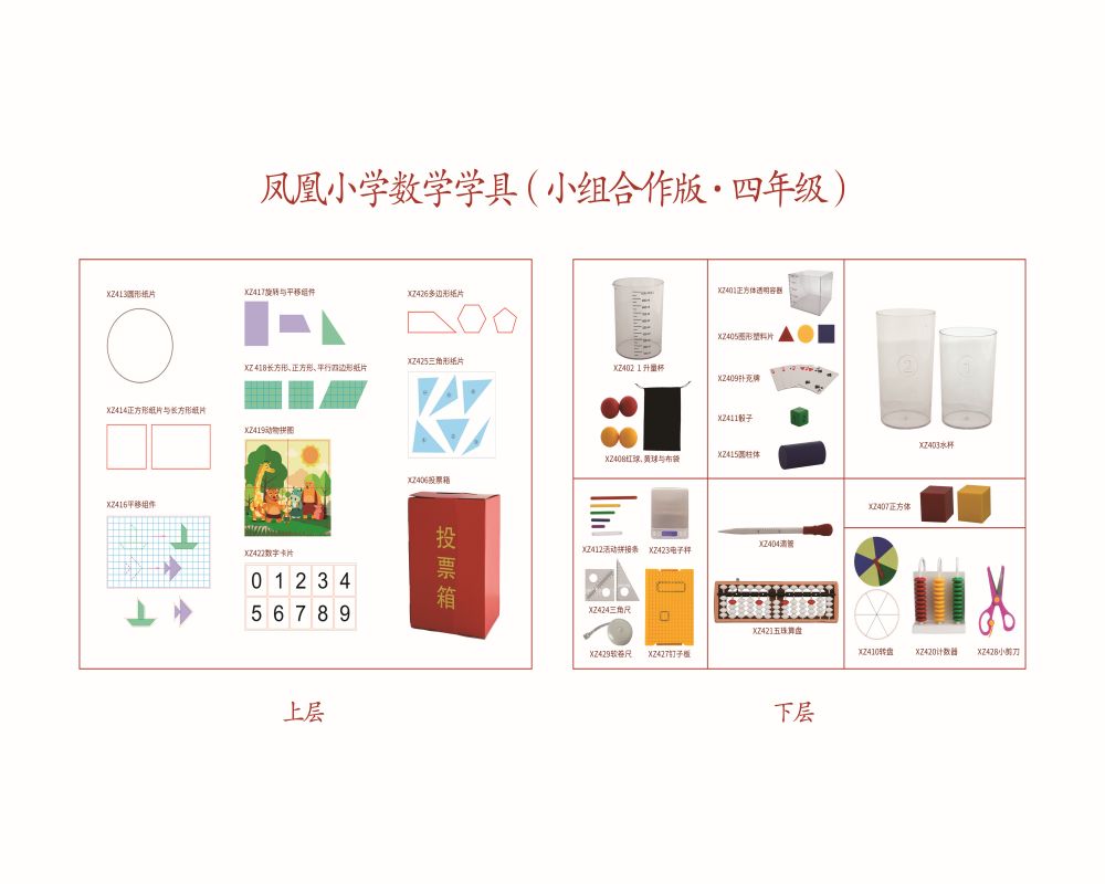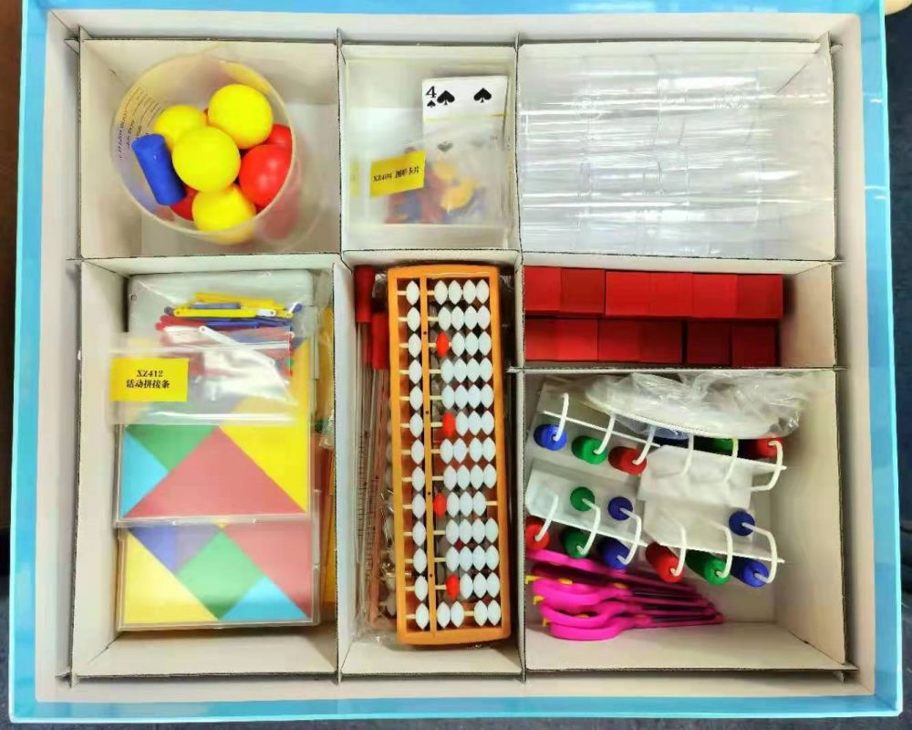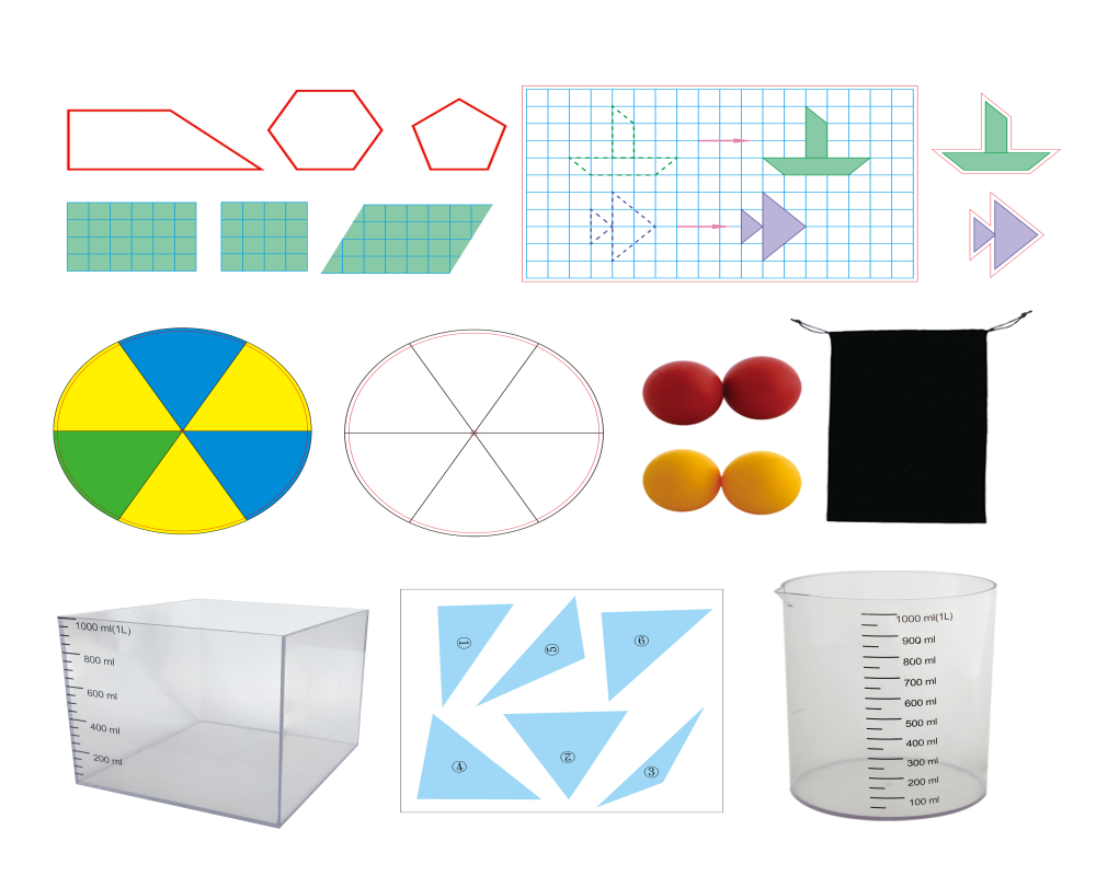 产品包含:1、正方体透明容器,2、1升量杯,3、水杯,4、滴管,5、图形卡片,6、投票箱,7、正方体,8、红球、黄球与布袋,9、扑克牌,10、转盘,11、骰子,12、活动拼接条,13、圆形纸片,14、正方形、长方形纸片,15、圆柱体,16、平移组件,17、旋转与平移组件,18、长方形、正方形、平行四边形纸片,19、动物拼图,20、计数器,21、五珠算盘,22、数字卡片,23、电子秤,24、三角尺,25、三角形纸片,26、多边形纸片,27、钉子板与橡皮筋,28、小剪刀,29、软卷尺,30、包装材质不少于2200g灰板,工艺:内裱158g铜版纸,光膜,尺寸:≥495x416x165mm。